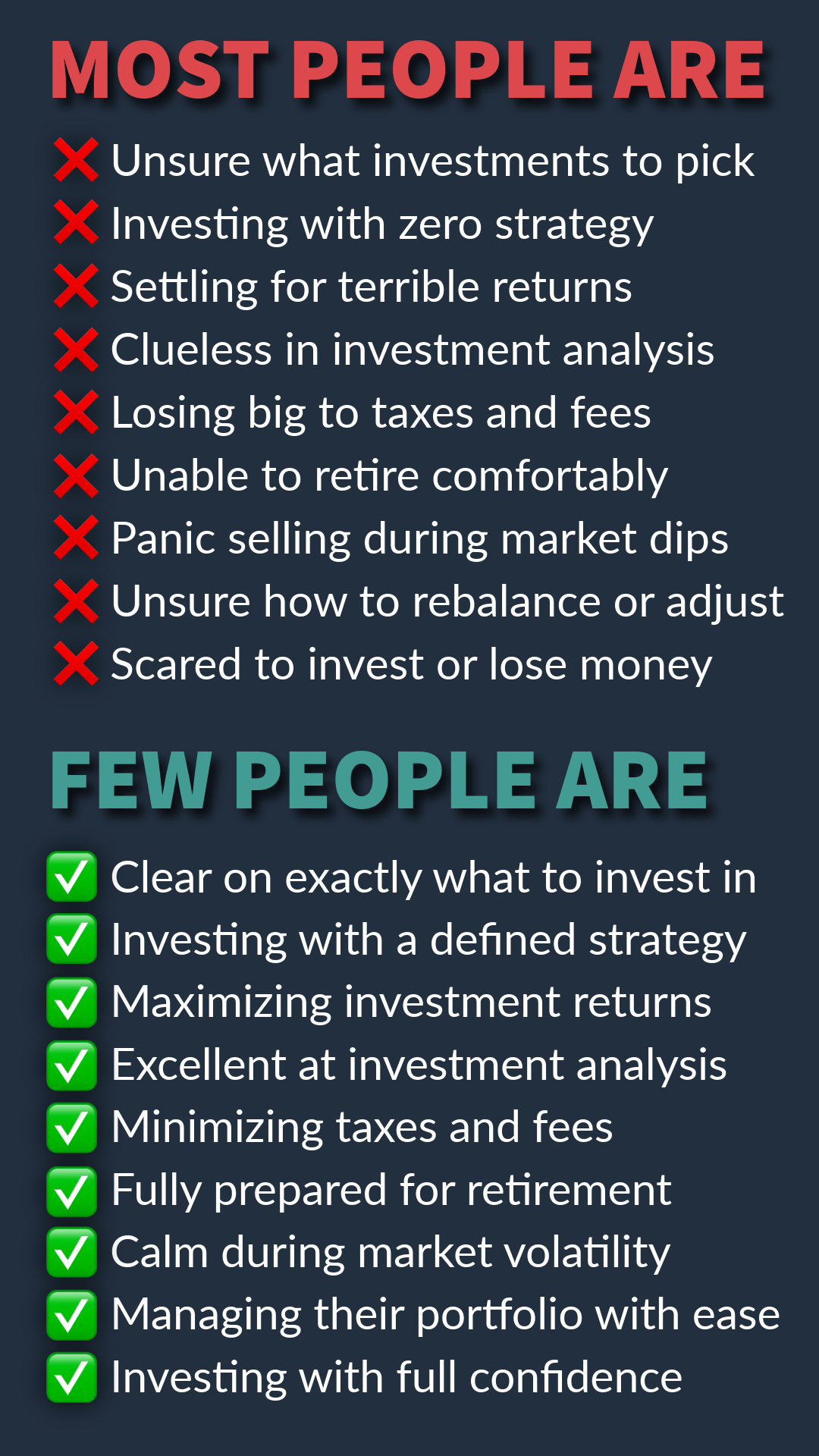 Most people don't even know where to begin, panic during market crashes, overpay in taxes and fees, and make investment choices without a clear plan. Some avoid investing altogether due to fear. Others think they’re doing well until they properly educate themselves and realize how much they didn't know or understand. All of these issues result in one painful outcome: most people end up suffering financially, whether they realize it now or later.