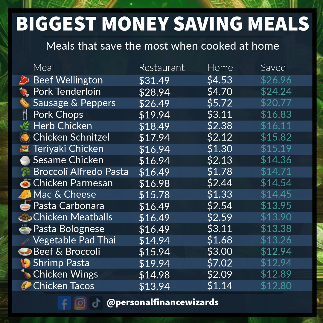 These are some of the meals with the biggest potential savings when cooked and eaten at home instead of ordered at a restaurant. Its no secret that eating out is expensive as restaurants add large markups to cover overhead and still make a profit. B...