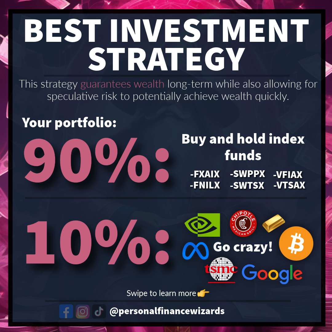 This is the best investment strategy as it guarantees wealth in the long-term while also allowing for the possibility of wealth in the short-term. To implement this strategy, put 90% of your future investments into low-cost index funds like FXAIX f...