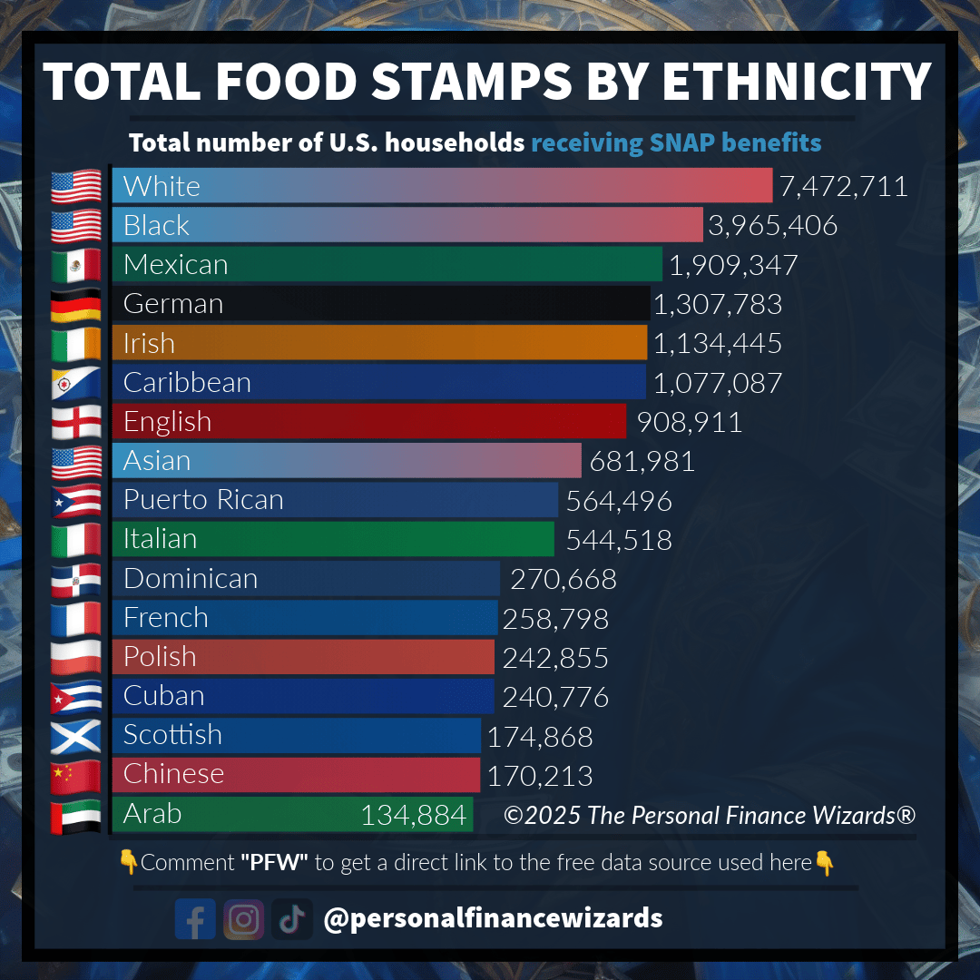 This data shows the percentage of U.S. households receiving SNAP benefits broken down by ethnicity. SNAP, formally known as food stamps, helps low-income families who struggle to make ends meet buy food. The program costs taxpayers around 100 billio...