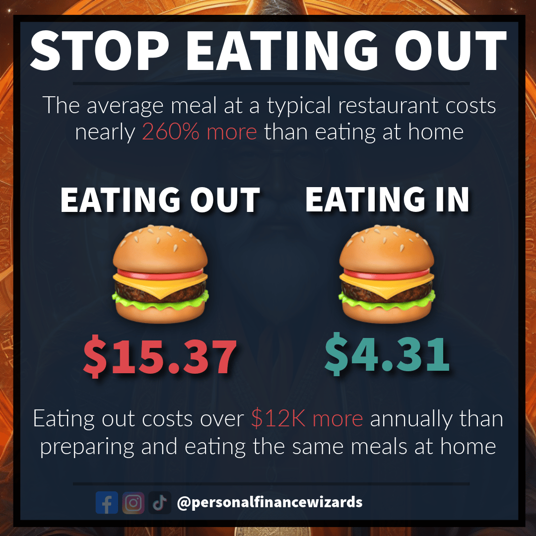 One of the most effective ways to cut expenses and create more room for saving, investing and paying off debts is to stop eating out. Restaurants often markup their prices significantly to turn a profit. On average, restaurant meals are sold at a 26...