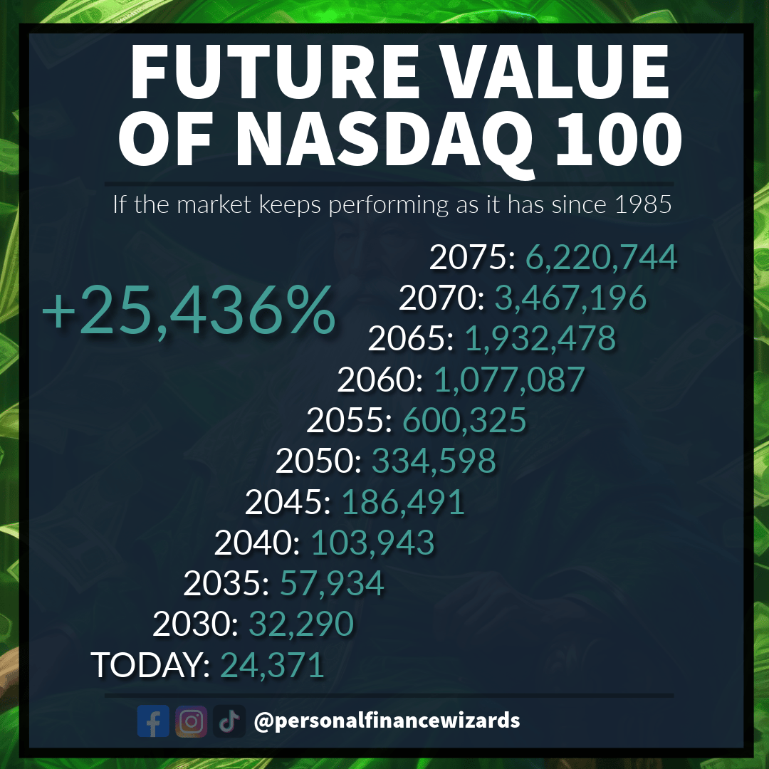 These are the projected values of the NASDAQ 100 every five years for the next 50, based on how the market has performed since 1985. This is not meant to be a precise prediction but rather a way to show just how much more room the market still has t...