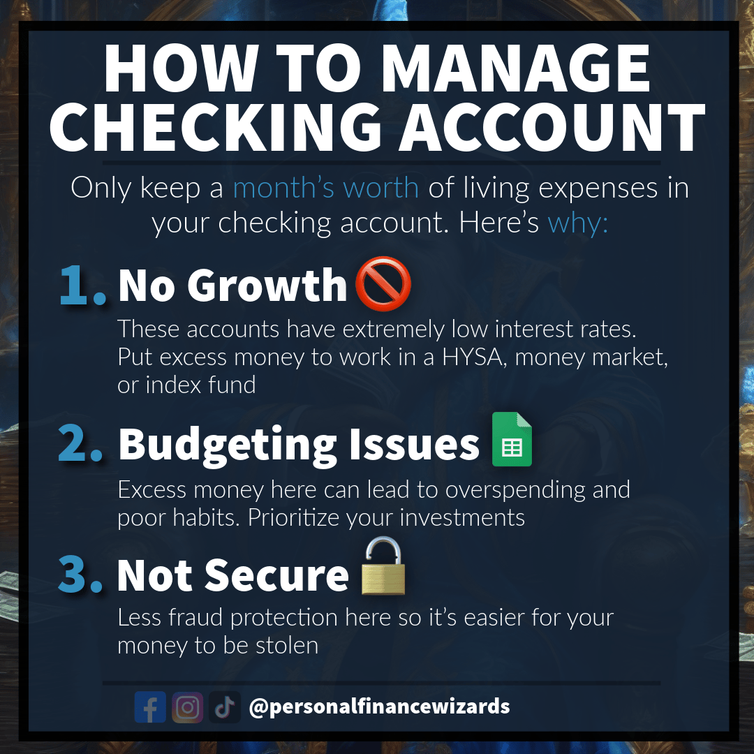 Here’s the ideal way to manage your personal checking account. You should only have one* checking account, keeping just enough money in it to cover your essential monthly bills like mortgage, car payments and credit card bills for things like your g...